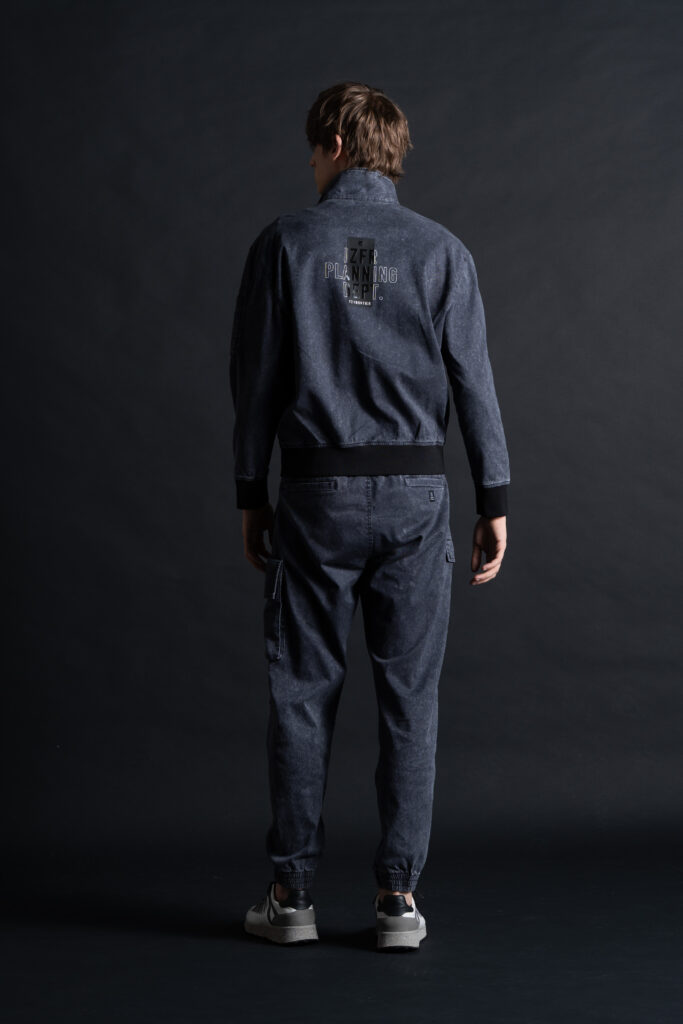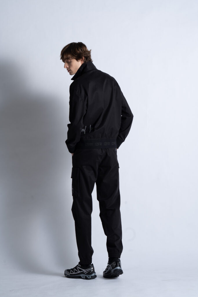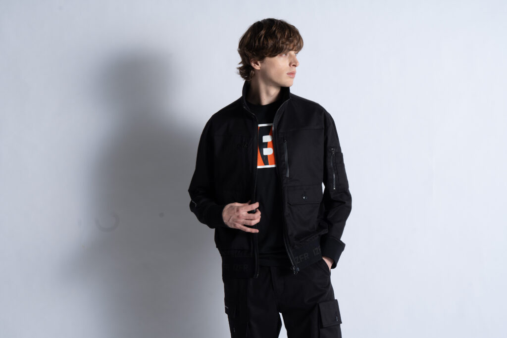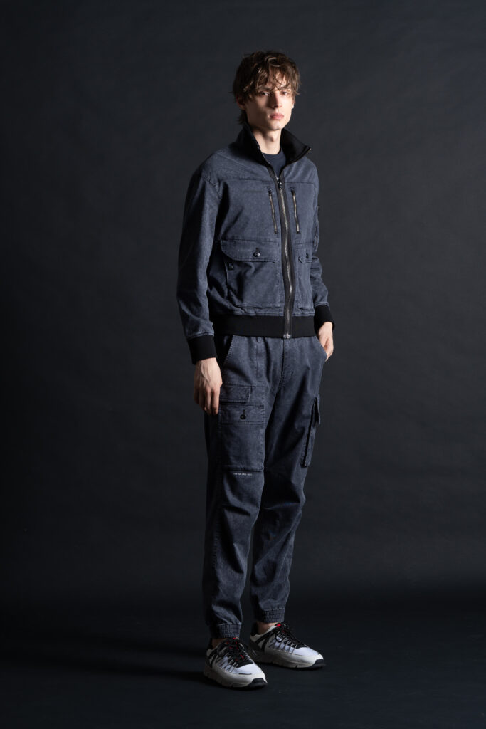 ・ジャケットは屈強なイメージを醸し出すボンバーシルエットを採用。特徴的なライダーステイストをプラスした脇側ビッグポケットがワイルド感とリッチ感を両立させ、ジャケット裾ゴムにはロゴ入りジャガード(05番色)を採用する等、他に類を見ない極上の世界観を表現します。
