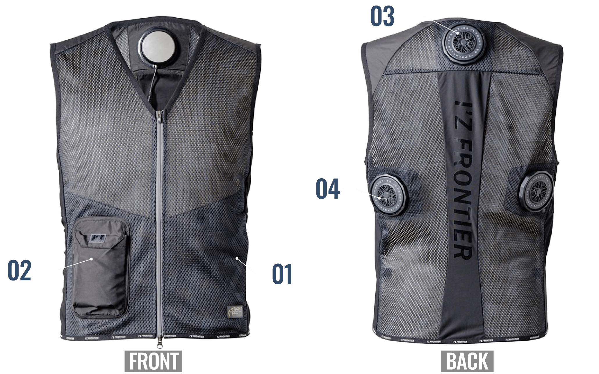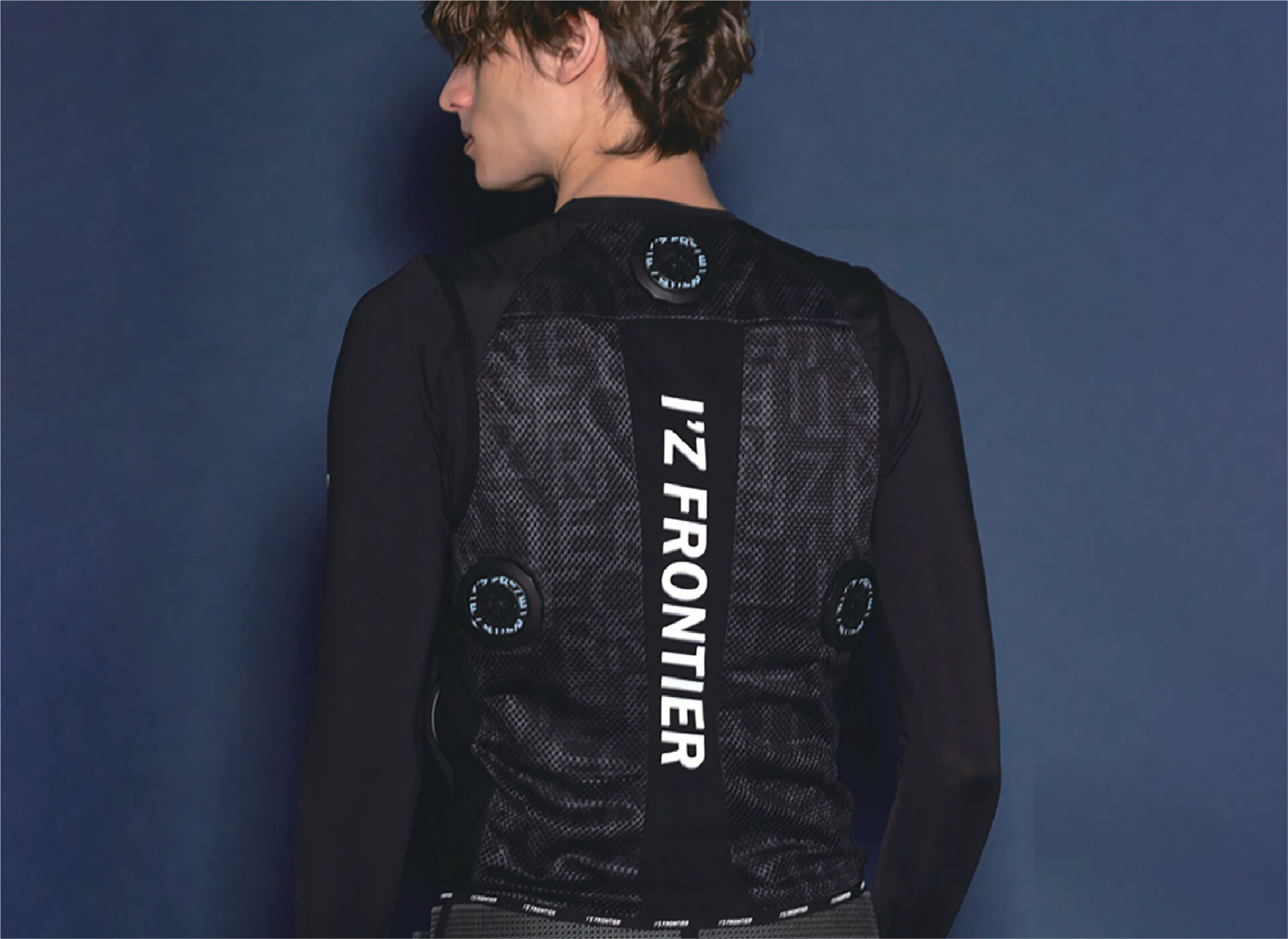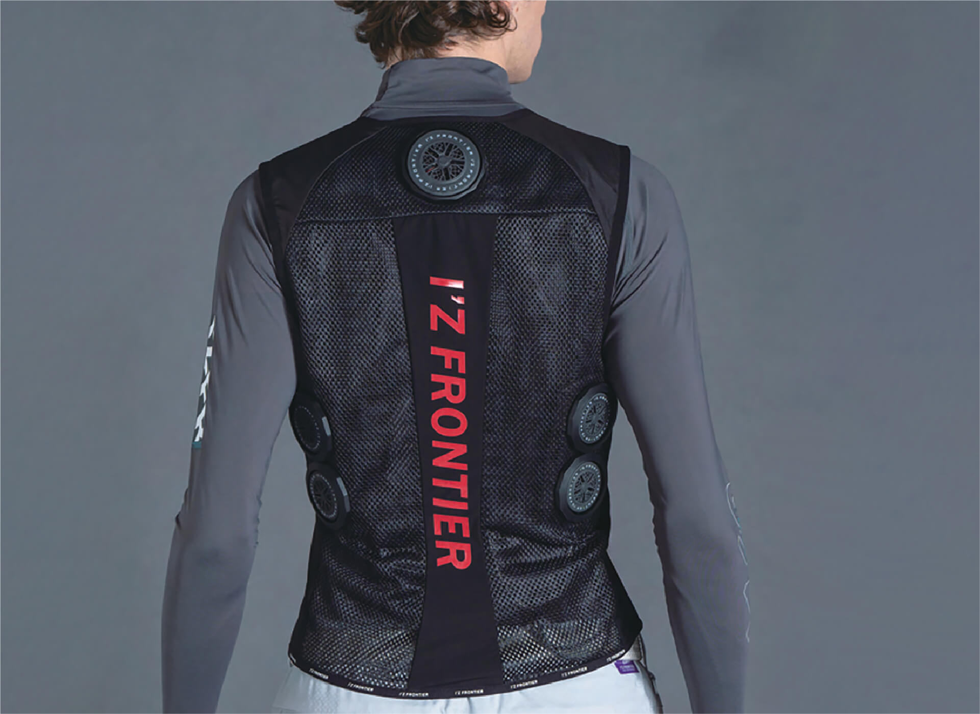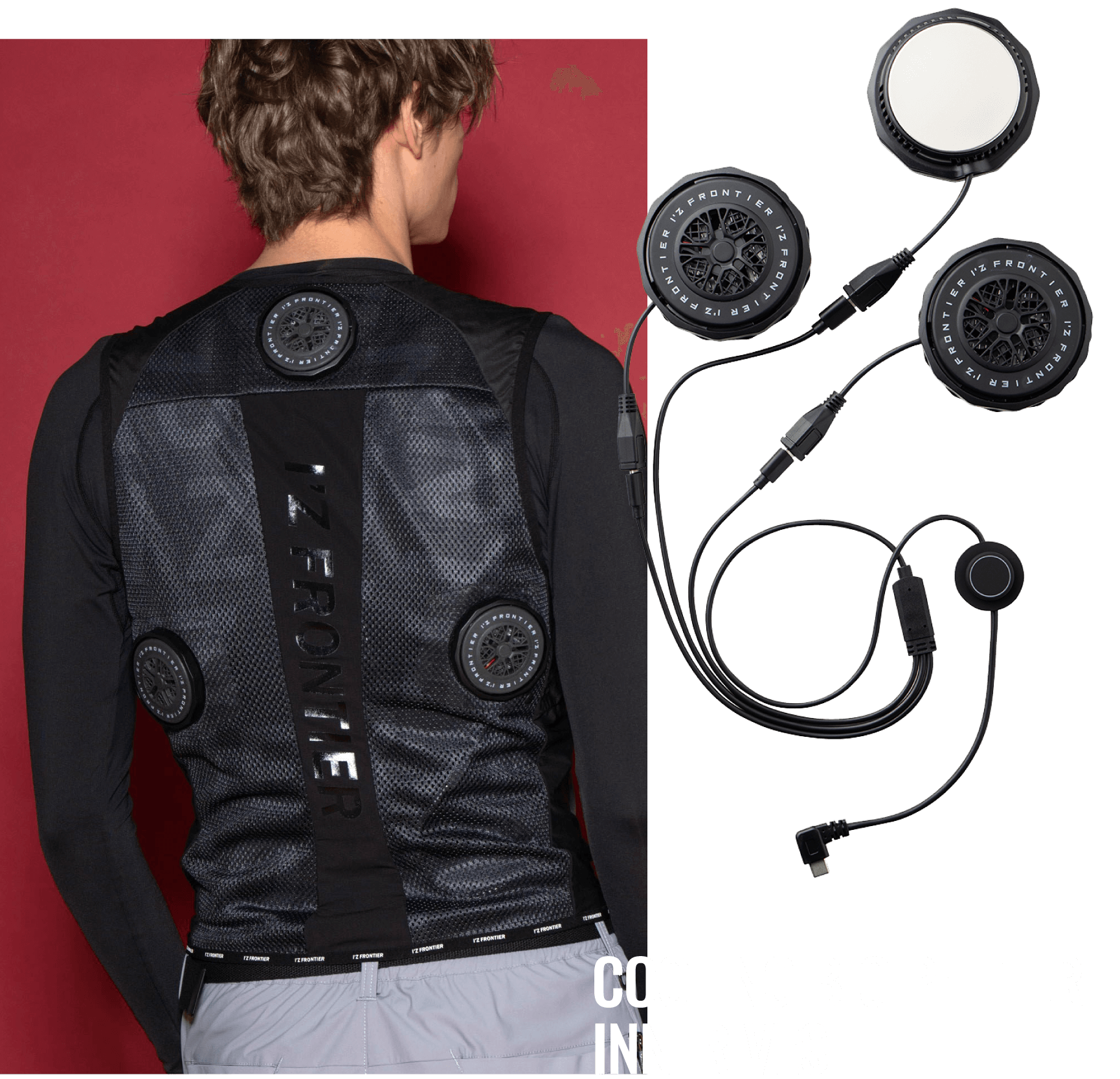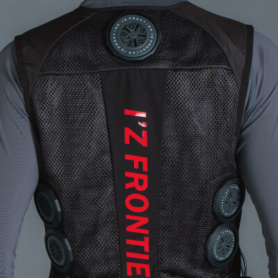 背面の計3ヶ所に直径7cmのペルチェデバイスを装着したニュータイプ冷却ウェア。デバイス接触部位は電源を入れ約10秒で環境温度より最大マイナス約25℃のハイレベルな冷却機能を発揮。動脈を冷やす事により効果的に身体全体をクールダウンさせ、猛暑時の疲労軽減を促し、熱中症対策として期待されます。