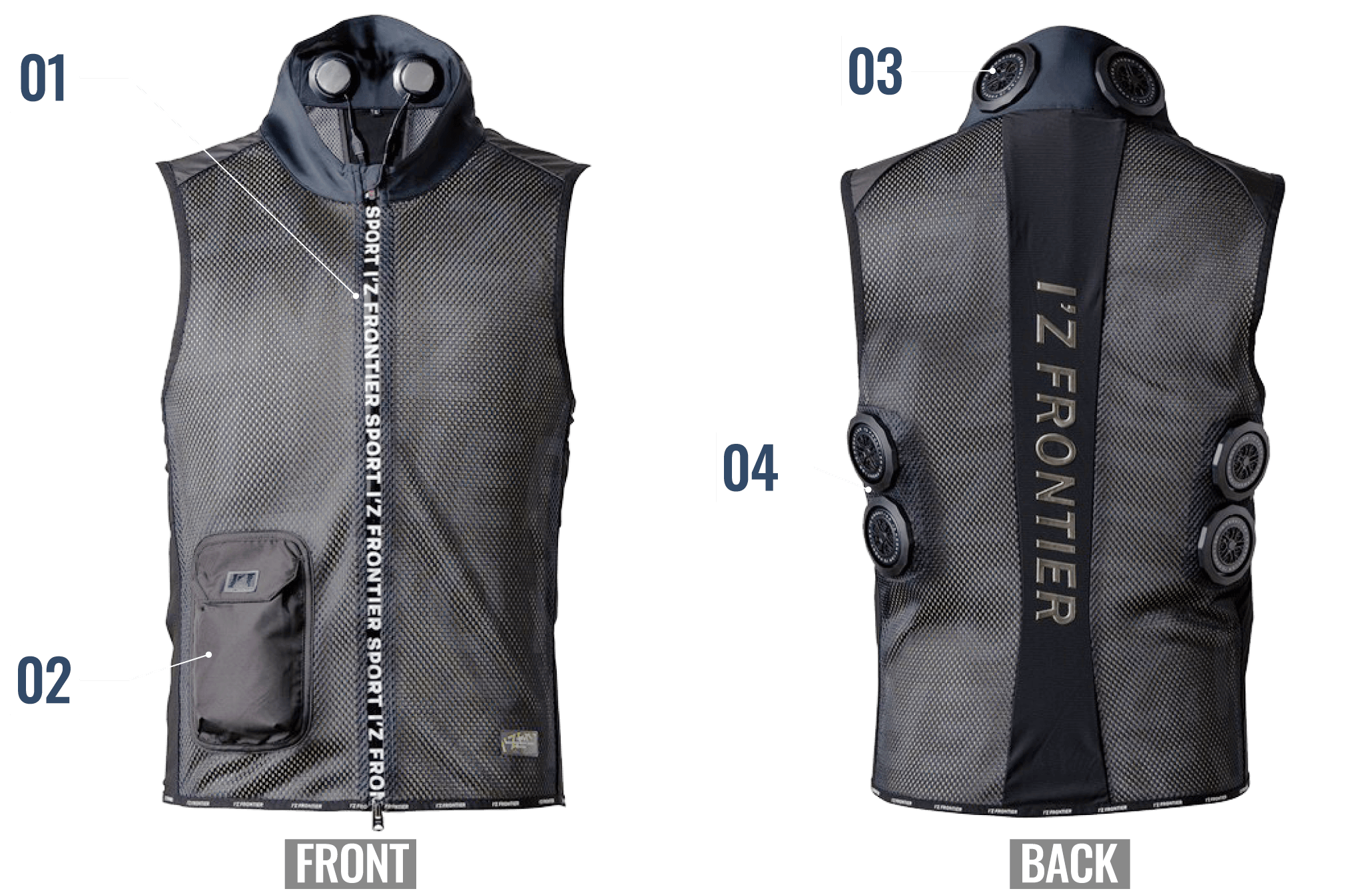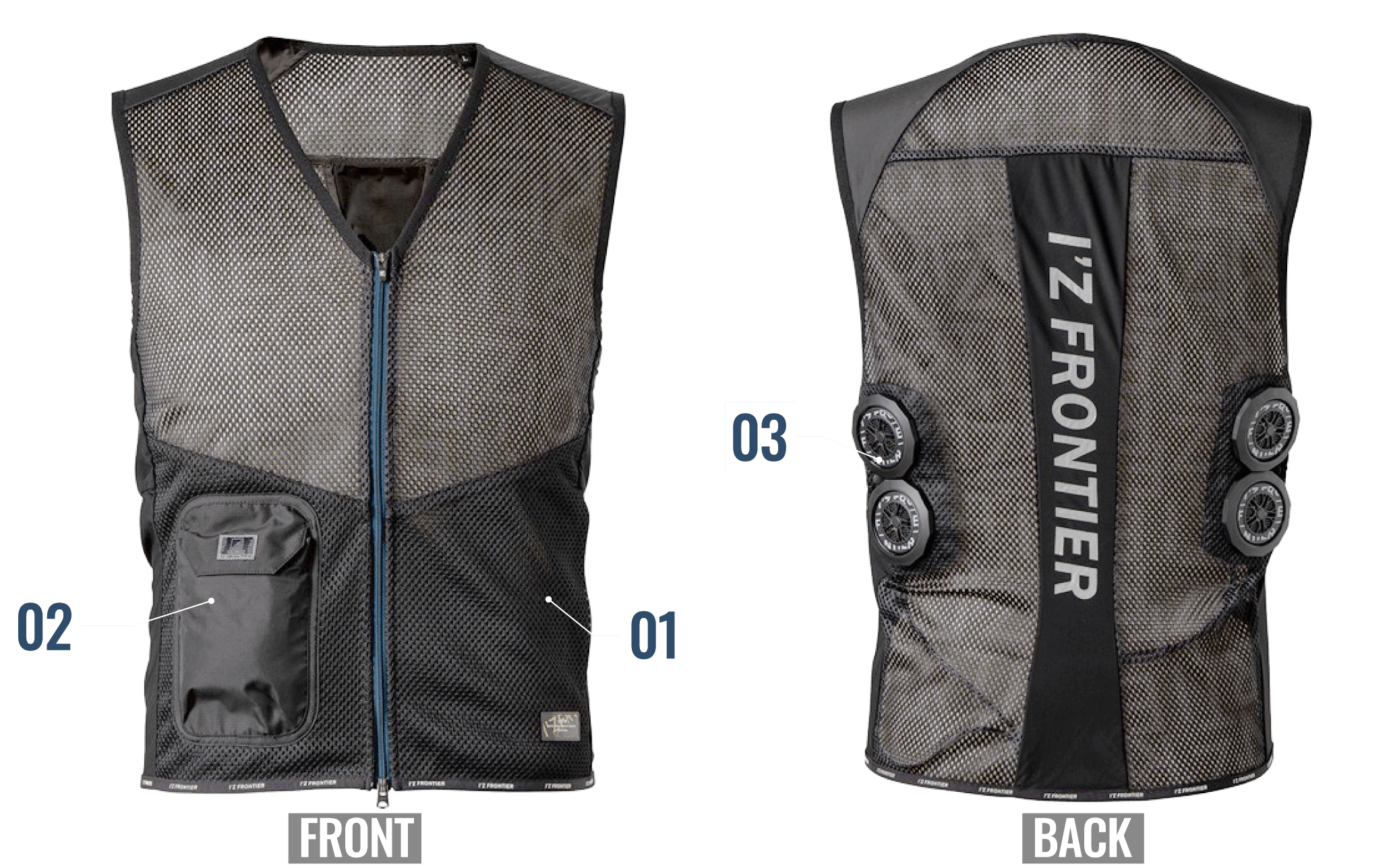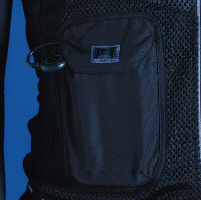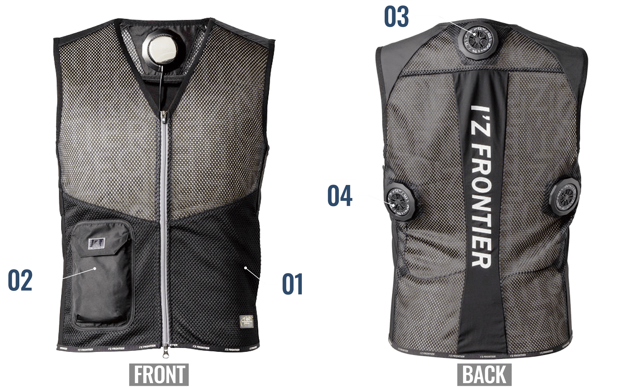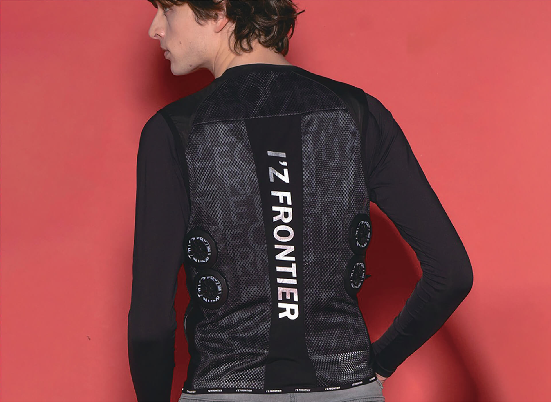 背面の計3ヶ所に直径7cmのペルチェデバイスを装着したニュータイプ冷却ウェア。デバイス接触部位は電源を入れ約10秒で環境温度より最大マイナス約25℃のハイレベルな冷却機能を発揮。動脈を冷やす事により効果的に身体全体をクールダウンさせ、猛暑時の疲労軽減を促し、熱中症対策として期待されます。