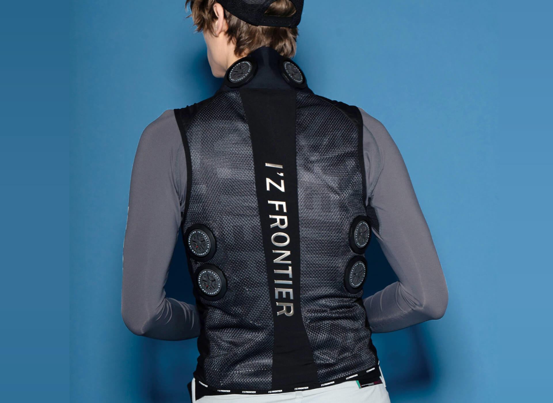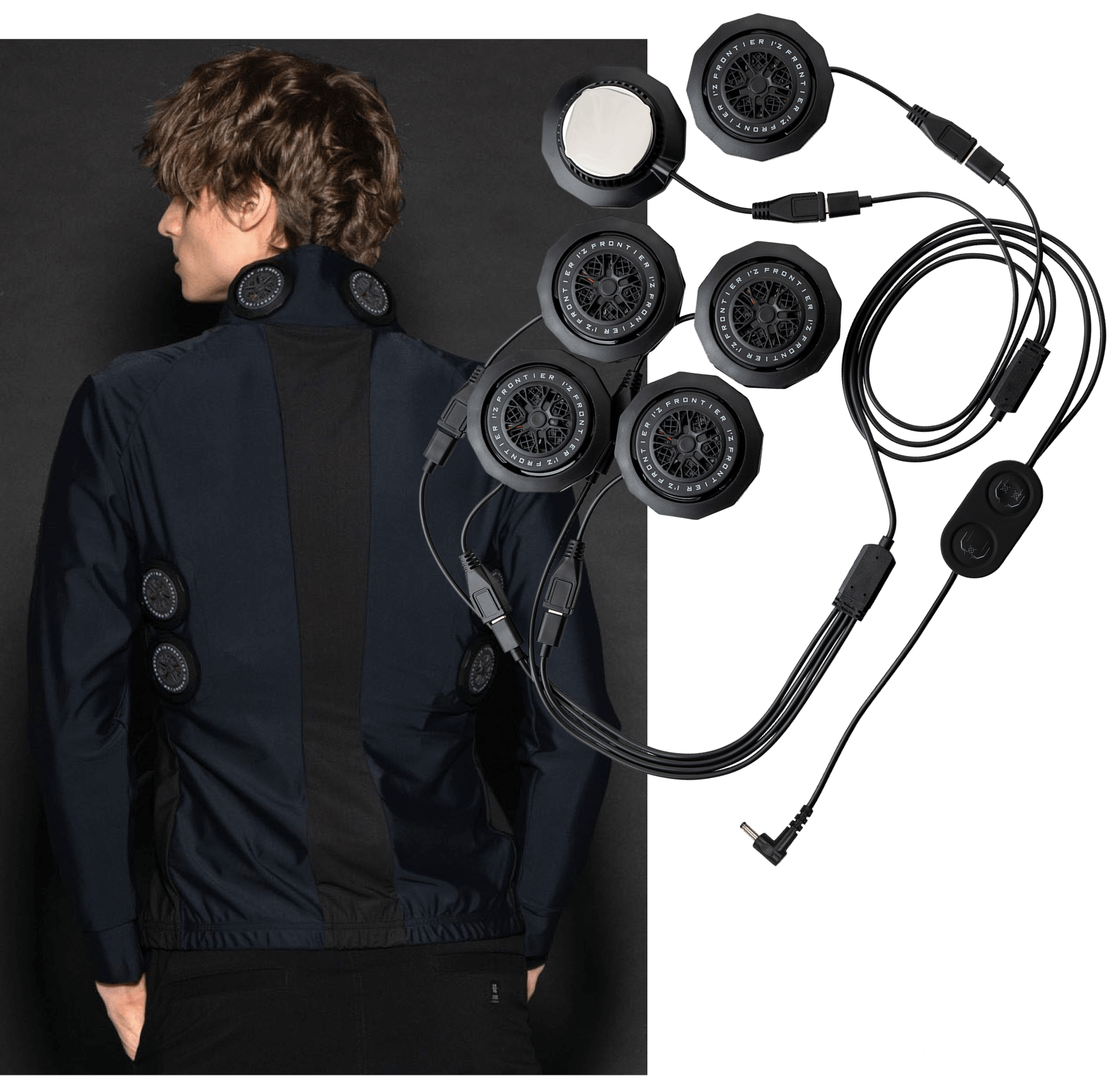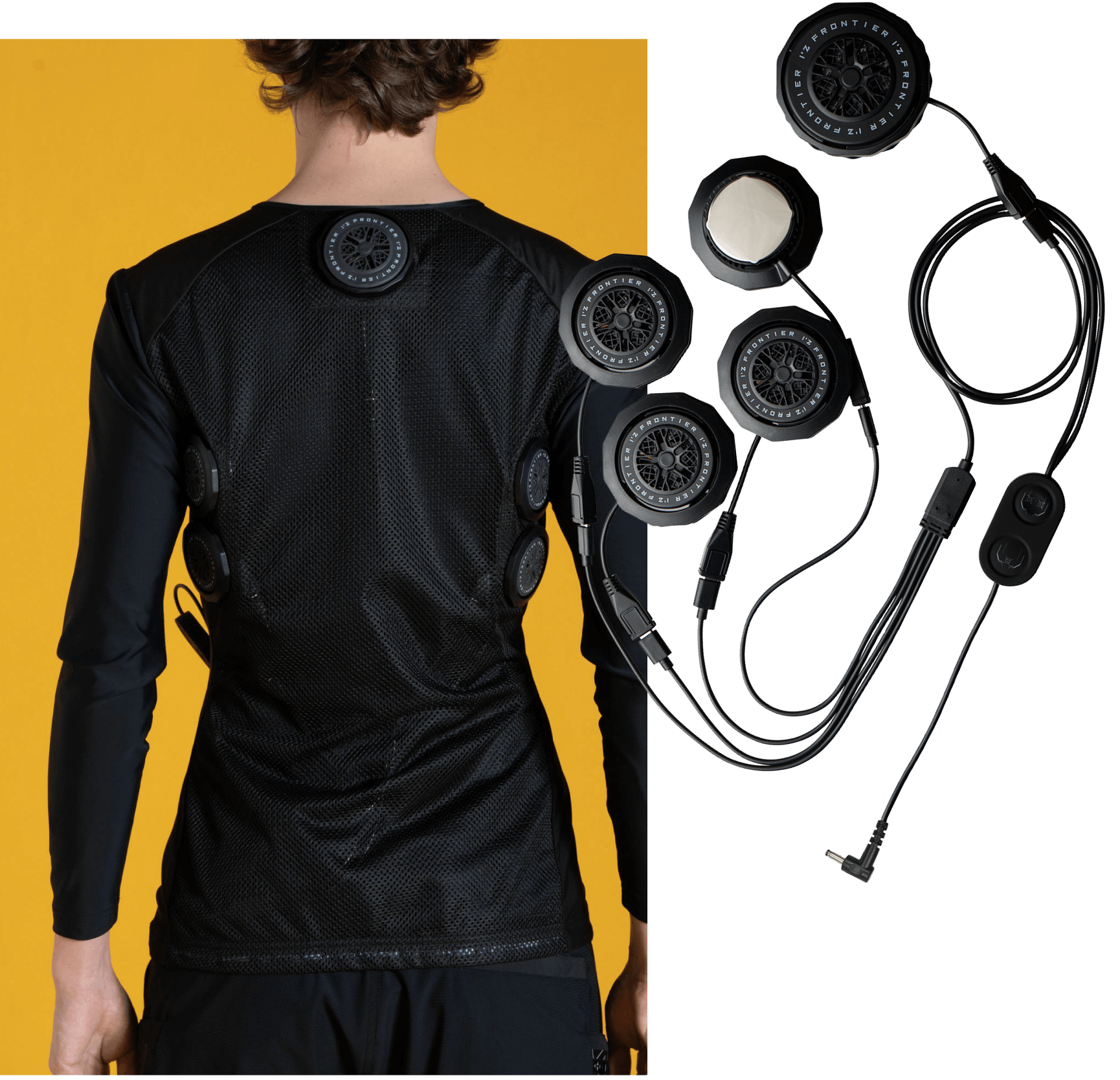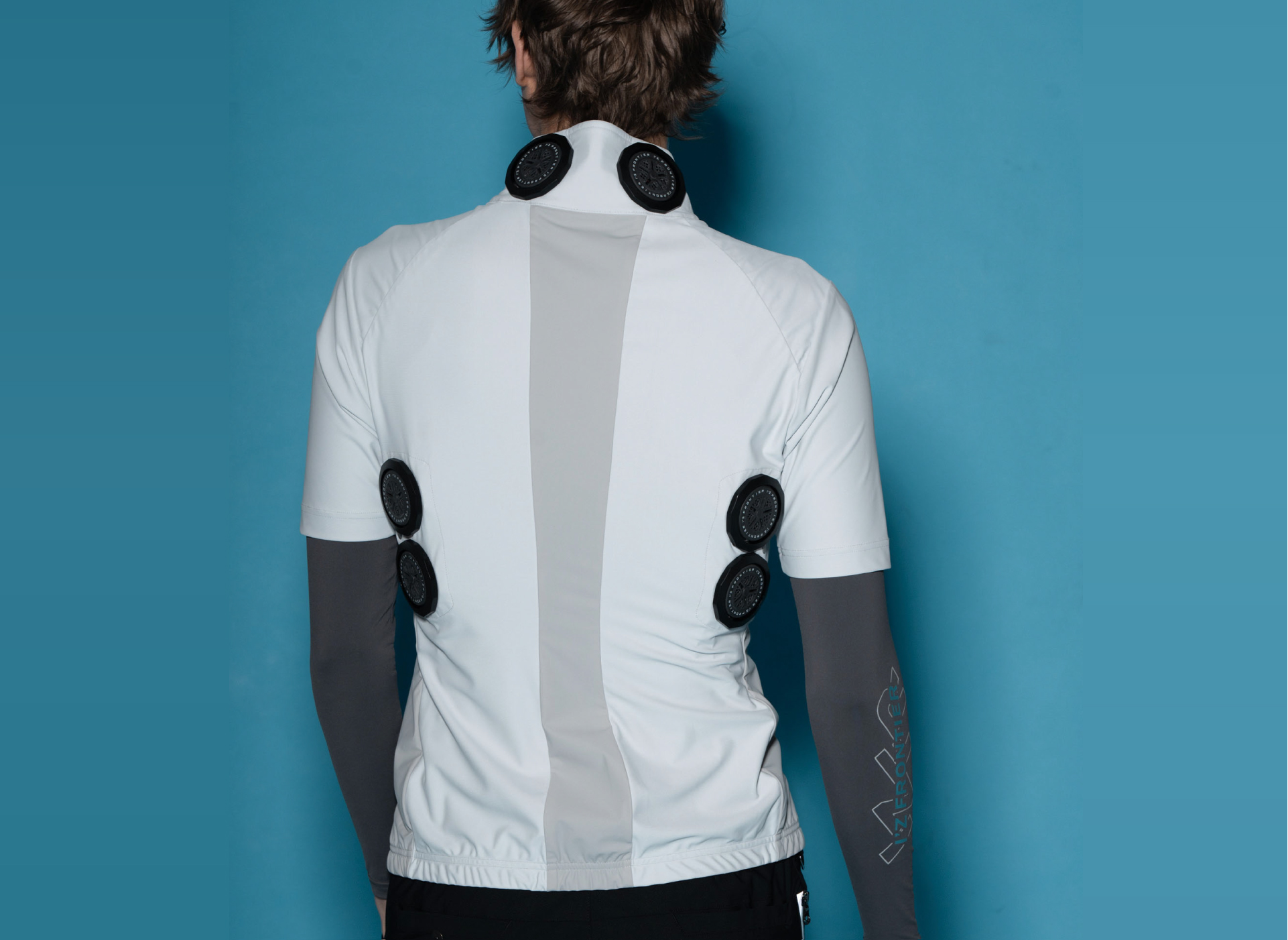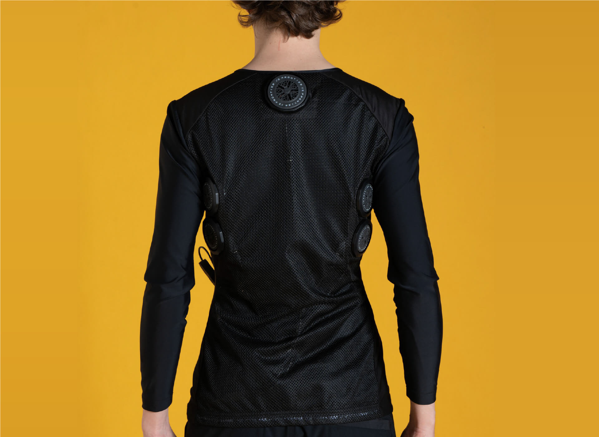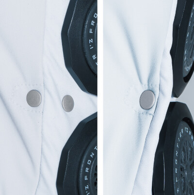 後ろ衿首と背面両脇の計6ヶ所に装着された直径5cmのペルチェデバイスは