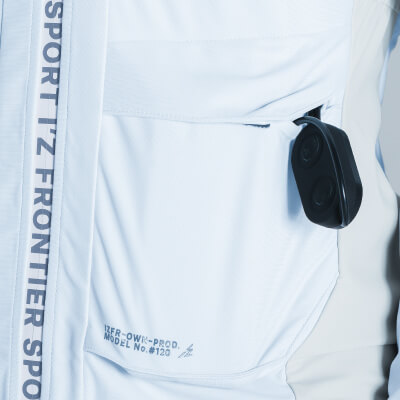 後ろ衿首と背面両脇の計6ヶ所に直径5cmのペルチェデバイスを装着したニュータイプ冷却ウェア。デバイス接触部位は電源を入れ約10秒で環境温度より最大マイナス約25℃のハイレベルな冷却機能を発揮。動脈を冷やす事により効果的に身体全体をクールダウンさせ、猛暑時の疲労軽減を促し、熱中症対策として期待されます。