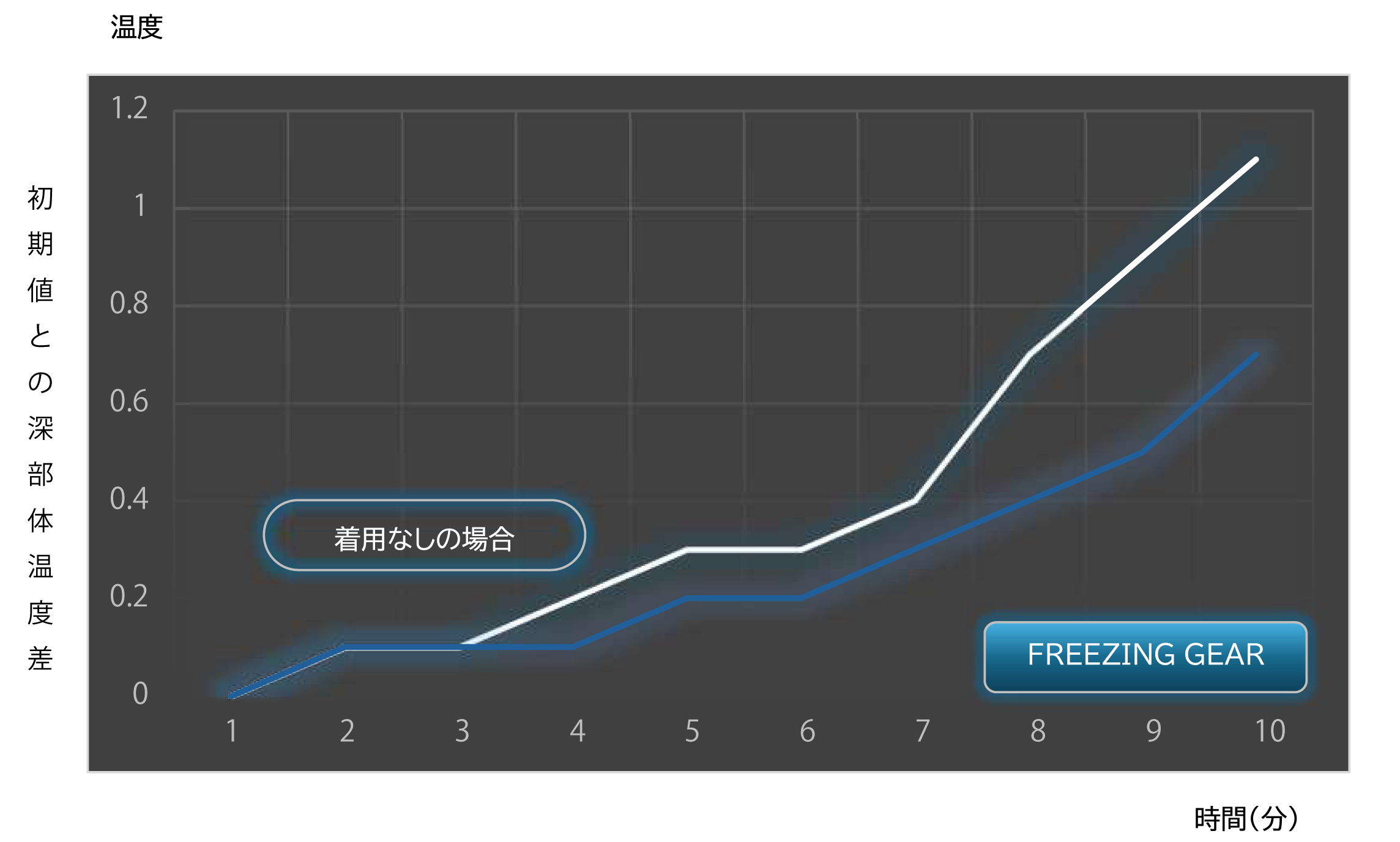 ②FREEZING GEAR(style No.#100/#104/#106/#1074)を着用した場合としなかった場合で、1分間隔ごとに深部温度計にて深部体温を測定。