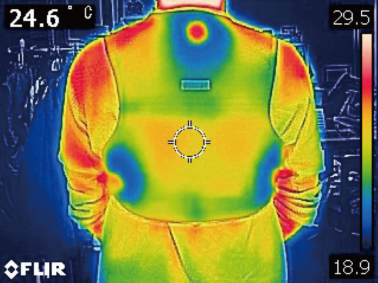 A new type of cooling wear that has Peltier devices with a diameter of 5 cm installed in three locations, on the back neck and on both sides. The area that comes in contact with the device exhibits a high-level cooling function of up to 22°C below the ambient temperature in about 10 seconds after turning on the power. By cooling the arteries, it effectively cools down the entire body, reduces fatigue during intense heat, and is expected to be a countermeasure against heatstroke.