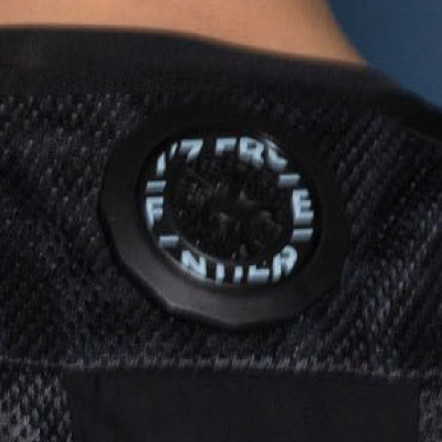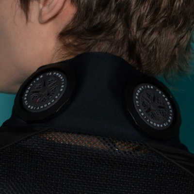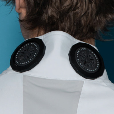 後ろ衿首と背面両脇の計6ヶ所に装着された直径5cmのペルチェデバイスは